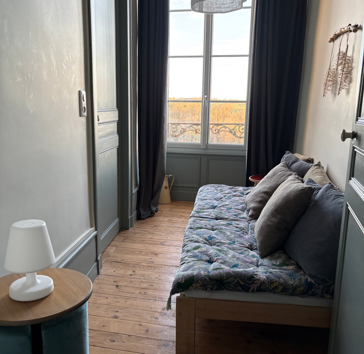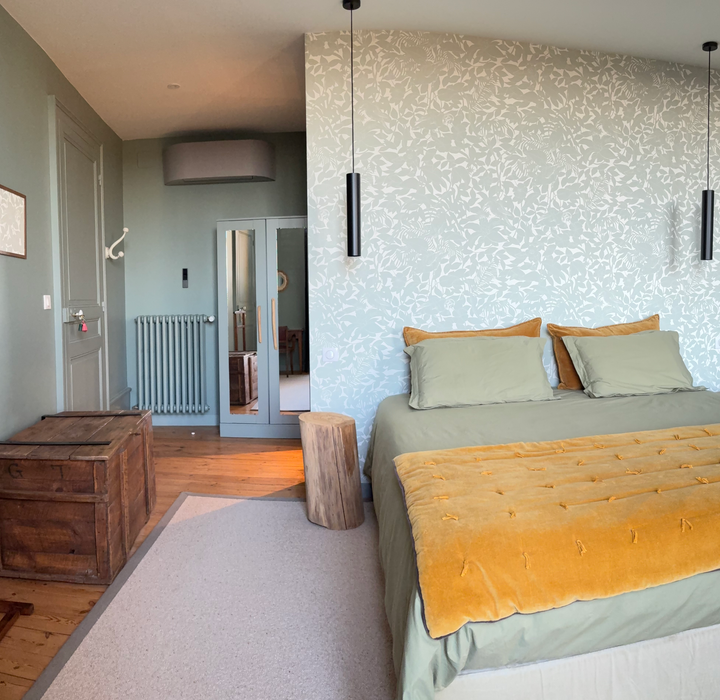 Le lit king size de 180 cm garantit un sommeil de qualité. Une pièce attenante avec lit simple permet d’adapter l’hébergement aux familles ou aux petits groupes recherchant un gîte de charme dans le Sud-Ouest.