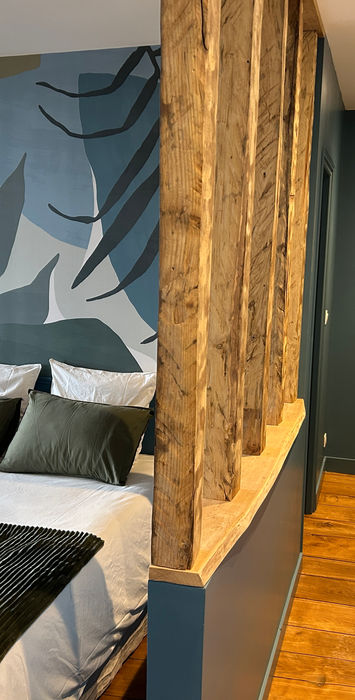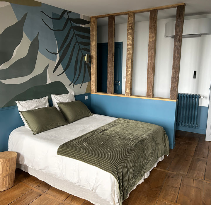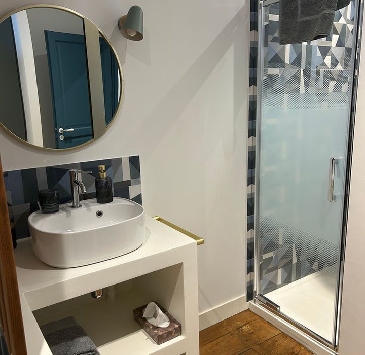La salle de bain fermée avec douche et le lit double de 160 cm complètent cet hébergement de charme, pensé pour allier détente, espace et fonctionnalité.