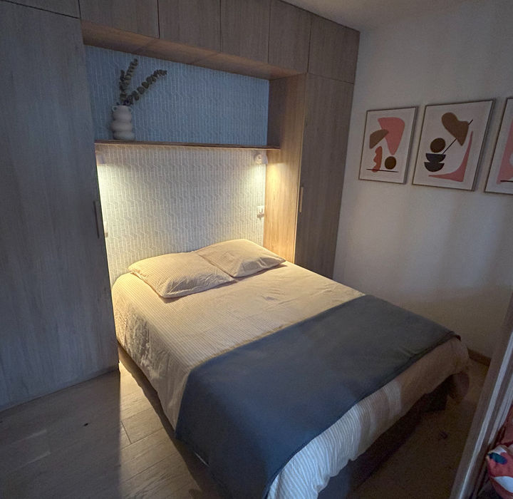 Le lit double de 140 cm assure un couchage confortable. Entièrement de plain-pied, ce studio est accessible aux personnes à mobilité réduite (fauteuils < 80 cm).